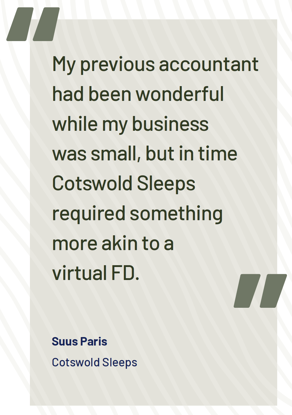 She moved to Panthera in early 2022 based on a recommendation from a friend. Having grown her own business predominantly through word of mouth, this provided Suus with reassurance in her choice. She said, “My previous accountant had been wonderful while my business was small, but in time Cotswold Sleeps required something more akin to a virtual FD to cover those financial decision making and forecasting skills I needed support with. I needed a step-up in my accountancy service, and Panthera now delivers a quality of service that matches my own standards in business.”