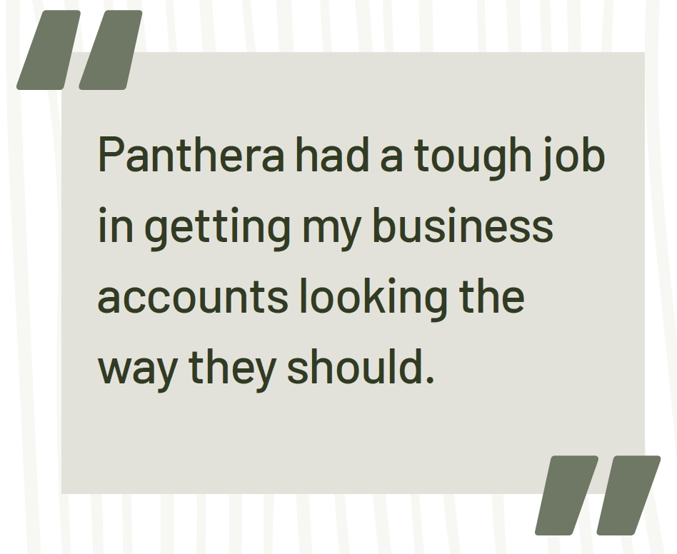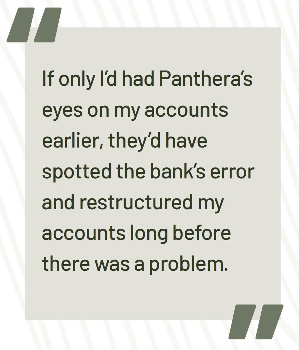 Through no fault of Suus, the bank’s error along with the reporting issues had given her confidence a significant battering. She rather regretted not making the change sooner, feeling that some of the difficulties could have been avoided. “If only I’d had Panthera’s eyes on my accounts earlier, they’d have spotted the bank’s error and restructured my accounts long before there was a problem. Panthera would have saved me a lot of stress.”